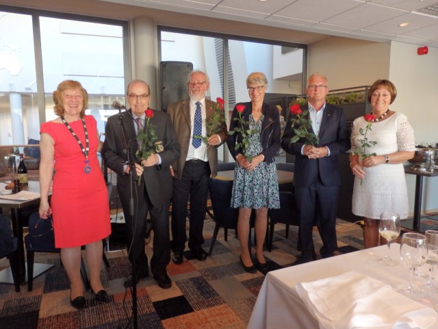 Eva Grete Storengen Skaar takker sine nærmeste medarbeidere for innsatsen i 2017 - 2018, fra høyre Oddbjørg Kvamme, kasserer, Leif Arnesen Koren, leder av programkomitéen, Astrid Haugen Vik, sekretærreserve 1, Knut Trosby, sekretær og Per Ottesen, seremonimester.