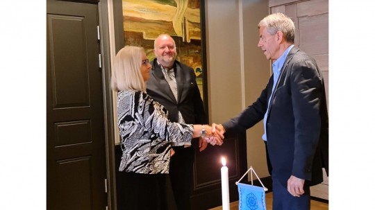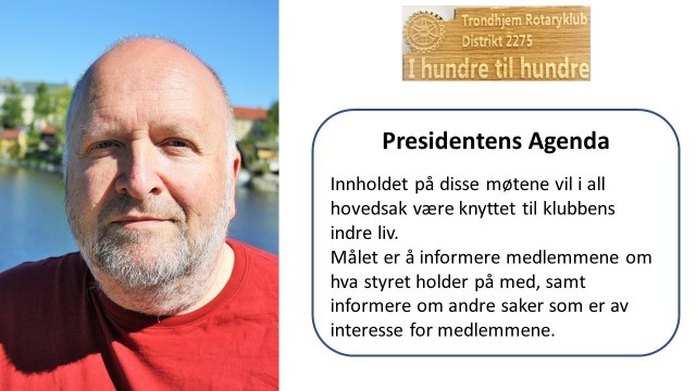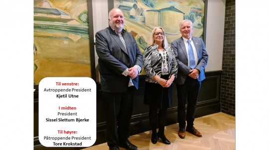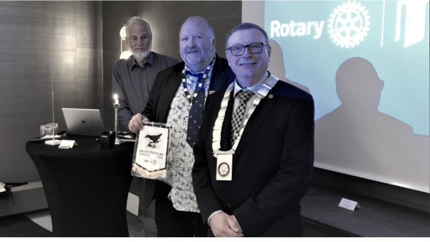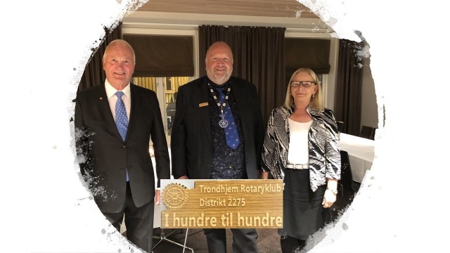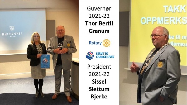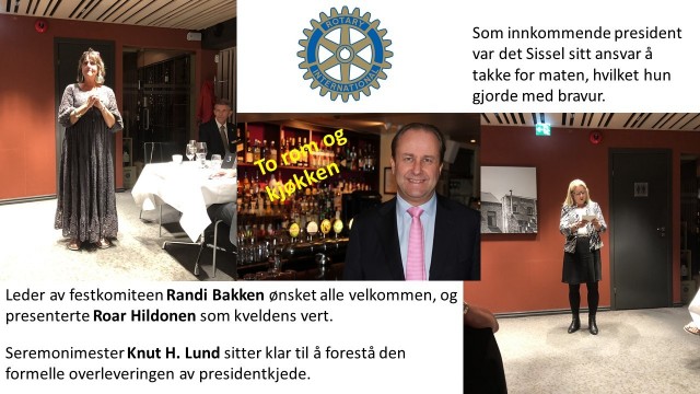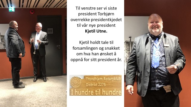 Her ser vi alle de tre presidentene samlet. Fra venstre siste President (Torbjørn), President (Kjetil) og innkommende President (Sissel). Kjetil sitt motto for året er "I hundre til hundre". Han vil på et senere møte fortelle hva som ligger bak mottoet.