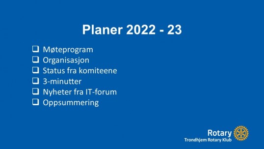 Første møte ved oppstart av nytt Rotary-år er med "Presidentens agenda". Presidenten forteller om planer, organisering og prosjekter.